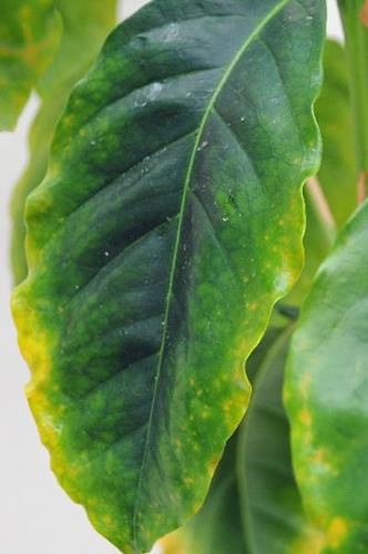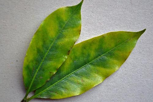 Las hojas jovenes desarrollan una clorosis irregular con una "costura" verde-amarilla a lo largo del margen que luego crece hacia la vena central. Puede así dejar un área con bordes en forma de sierra al rededor de las venas principales.