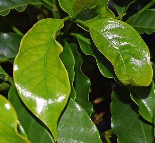 Hojas jovenes muestran un clorótico irregular con una costura amarillo/verdoso a lo largo del margen de la hoja que luego se extenderá hacia la vena central. Esto puede dejar un área con bordes en forma de sierra al rededor de las venas principales.