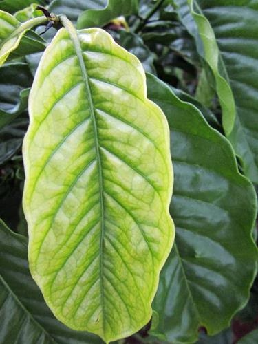 Las hojas jovenes desarrollan clorosis irregular con una costura verde-amarilla a lo largo del margen que luego crece hacia la vena central. Puede así dejar un área con bordes en forma de sierra al rededor de las venas principales. Si sigue la carencia, las venas tomarán una descoloración naranja-marrón también.