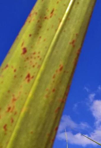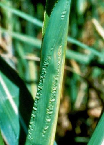 Los síntomas comienzan en las hojas jóvenes que muestran puntos necróticos y parcialmente divididos apuntando hacia abajo. Hojas quebradizas, arrugadas y angostas. Manchas pardas irregulares obscuras y claras se extienden por la hoja. Lesiones translúcidas podrán aparecer entre las venas y aparecerán pequeñas gotas de agua en la superficie superior de la hoja. Los puntos de crecimiento se distorsionan y podrán marchitarse. Desarrollo excesivo de macollos dará una apariencia de arbusto a la planta. Crecimiento y rendimiento se reducen.