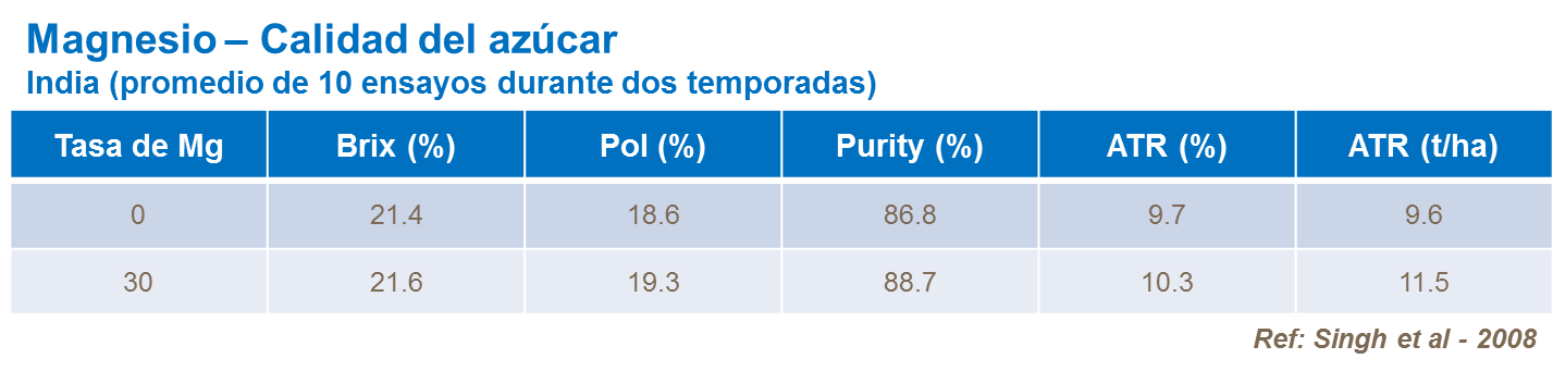 El suministro de magnesio ayuda en mantener el contenido de sacarosa en la caña por fomentar la síntesis de proteínas. El suministro de magnesio también influye en el azúcar y el contenido de sacarosa se reduce donde nutrición de magnesio esté inadecuado.