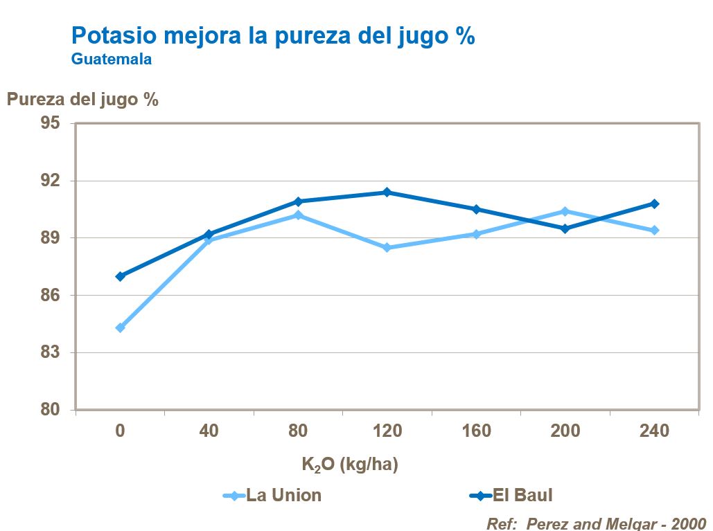 Potasio tiene una función clave en la síntesis de azúcares y su translocación a la caña. También mejora la calidad del azúcar aumentando los niveles de Pol y grados Brix, y reduce el contenido de fibras. Absorción de lujo o sea niveles muy altos de potasio, tienen un efecto negativo en la cristalización del azúcar. Potasio mejora la pureza del jugo, pero es también importante equilibrar el uso del nitrógeno con el potasio para maximizar la conversión del azúcar, contenido y calidad del jugo. Aplicaciones tardías pueden reducir la pureza del azúcar, su color y clarificación.