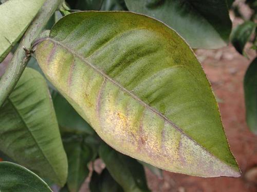 Los síntomas comienzan en las hojas viejas, las cuales se vuelven parcialmente amarillas. En casos de deficiencias severas aparecen pecas marrones que se esparcen y se van juntando. Esta decoloración aparece primero a lo largo de la nervadura principal.
