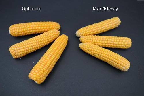 Deficiencia de potasio en mazorcas (derecha).