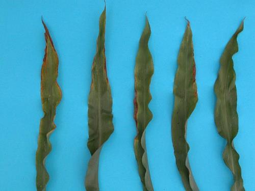 Deficiencia de potasio (foto: de izquierda a derecha se incrementa la deficiencia).