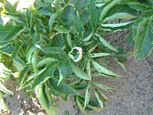 Deficiencia de cobre en las hojas. Normalmente las patatas no son sensibles a la deficiencia de cobre. Los síntomas se pueden observar en raras ocasiones en el campo.