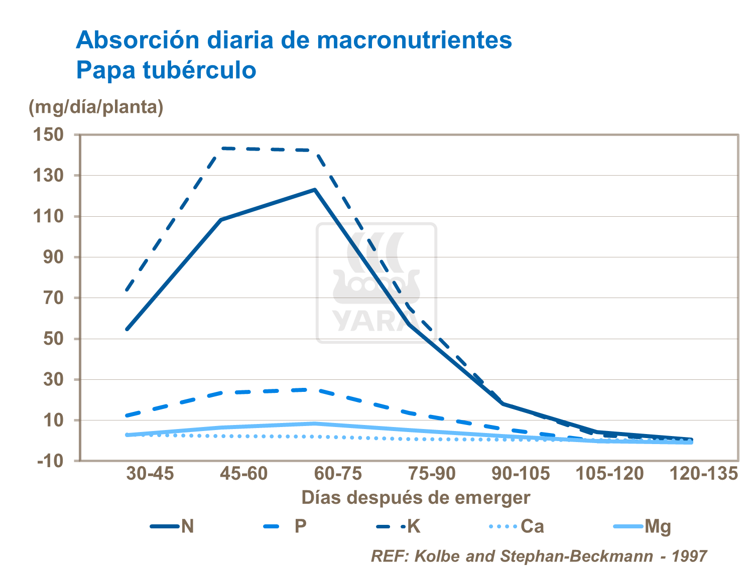 El potasio es el elemento que más se consume por el cultivo de papas, y junto con nitrógeno se requiere en cantidades mayores para obtener rendimientos altos. Las necesidades de fósforo, calcio y magnesio son menores. La remoción difiere de un campo a otro y depende de la producción, pero el cultivo de la papa puede consumir 50% más potasio que nitrógeno. Como se puede ver de este gráfico, un cultivo de 35t/ha podrá remover más de 200 kg/ha de potasio y 115 kg/ha de nitrógeno.